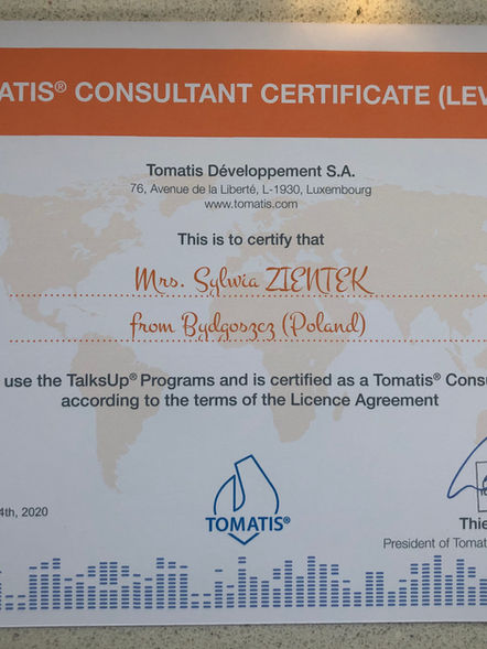Certyfikowane szkolenia z metody Tomatisa 1,2,3, oraz najwyższy - 4 stopnia - nadające tytuł Konsultanta Metody Tomatis® Developpement S.A. Luksemburg